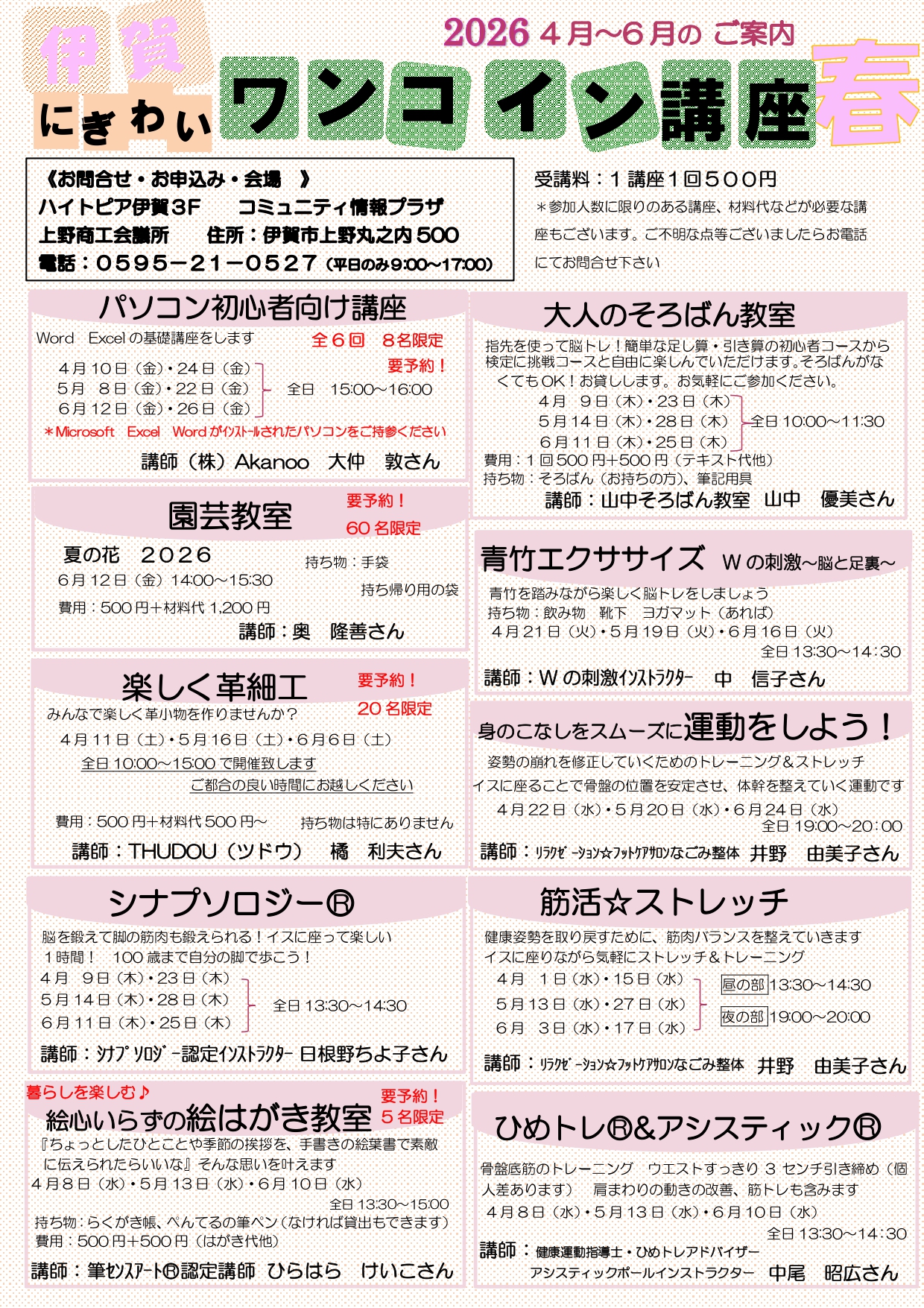 コミュニティー情報プラザのイベント情報(2026春) ➢伊賀にぎわいワンコイン講座 ワンコインでお手軽に講座を楽しんでいただけます。 ワンコイン講座チラシ2026春 お申し込みは上野商工会議所までお電話ください。 TEL:0595-21-0527 (平日9:00~17:00) ※画像はクリックで拡大します。